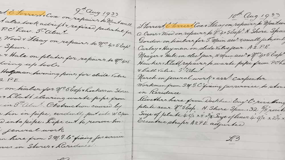 Inside the Engine Rooms at Tower Bridge, you can find an old workbook containing a neatly written diary of the works undertaken at the Bridge across two years - 1933 to 1934. In its pages you will discover the names of the people employed to take care of the Bridge: Arthur William Cross, William Joseph Meager, C. Hale, W. Wood, Stanley Thomas Fleay, Charles Campbell Carley, Thomas Hayman and many more.