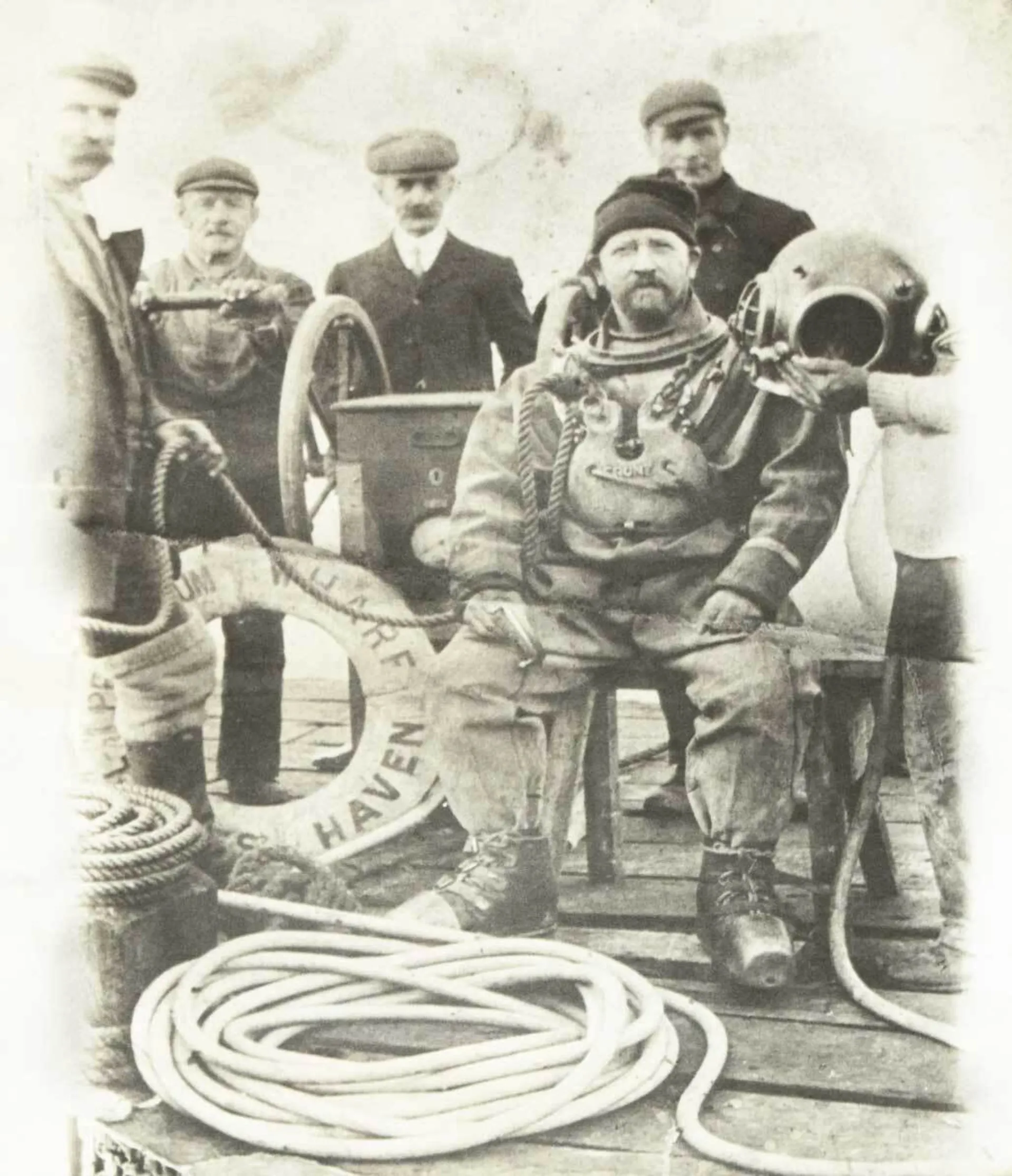The leader of the team, Friend Samuel Penney, was a Quaker (hence his first name) and is said to have been of Scandinavian origin. In the 1901 census, he is listed as a ‘submarine diver’. He was involved in many important projects at the time, including Southend Pier (then the longest pier in the world). Only a few years ago his family discovered a historic photograph of the divers preparing for descent at Tower Bridge (opposite).