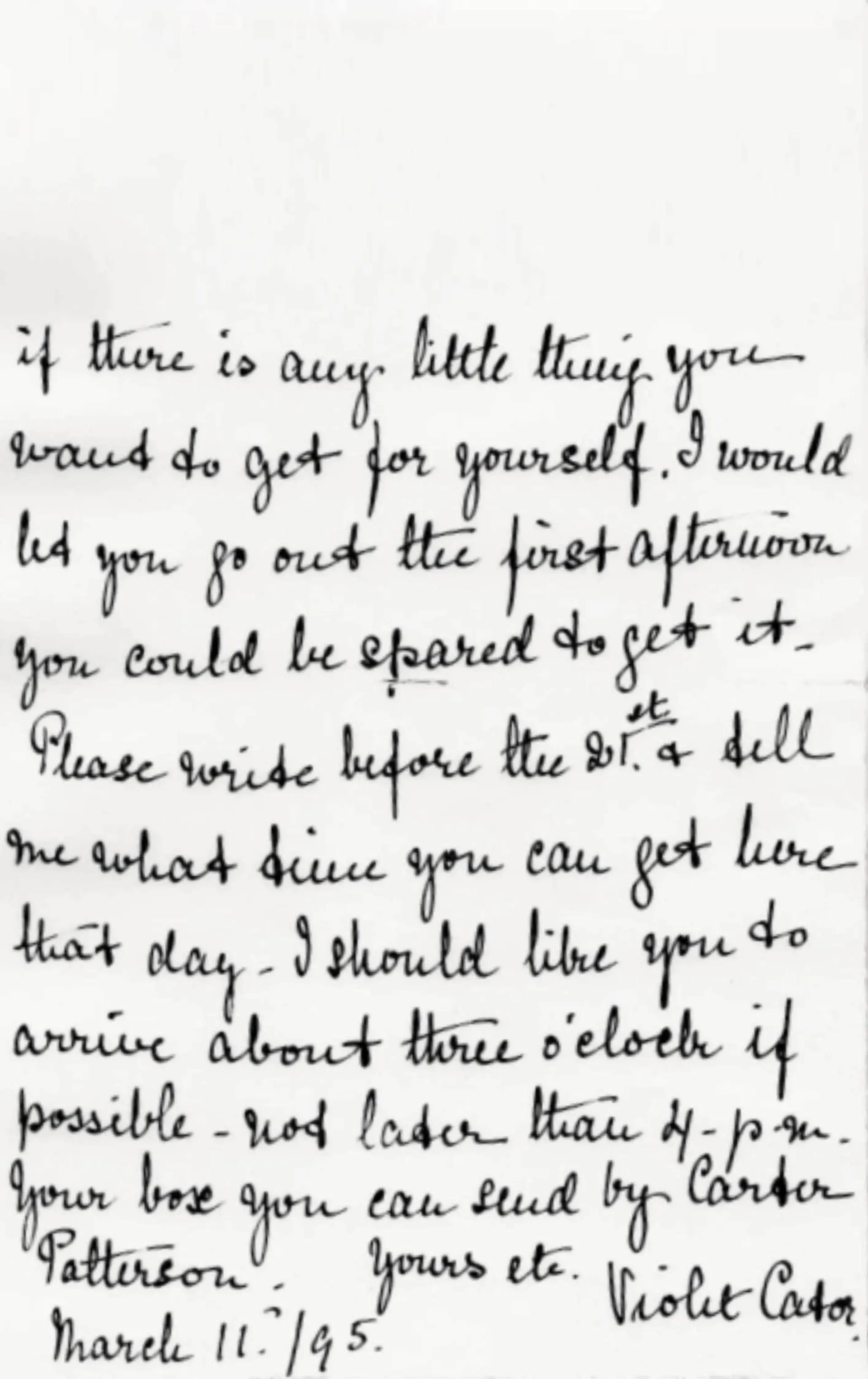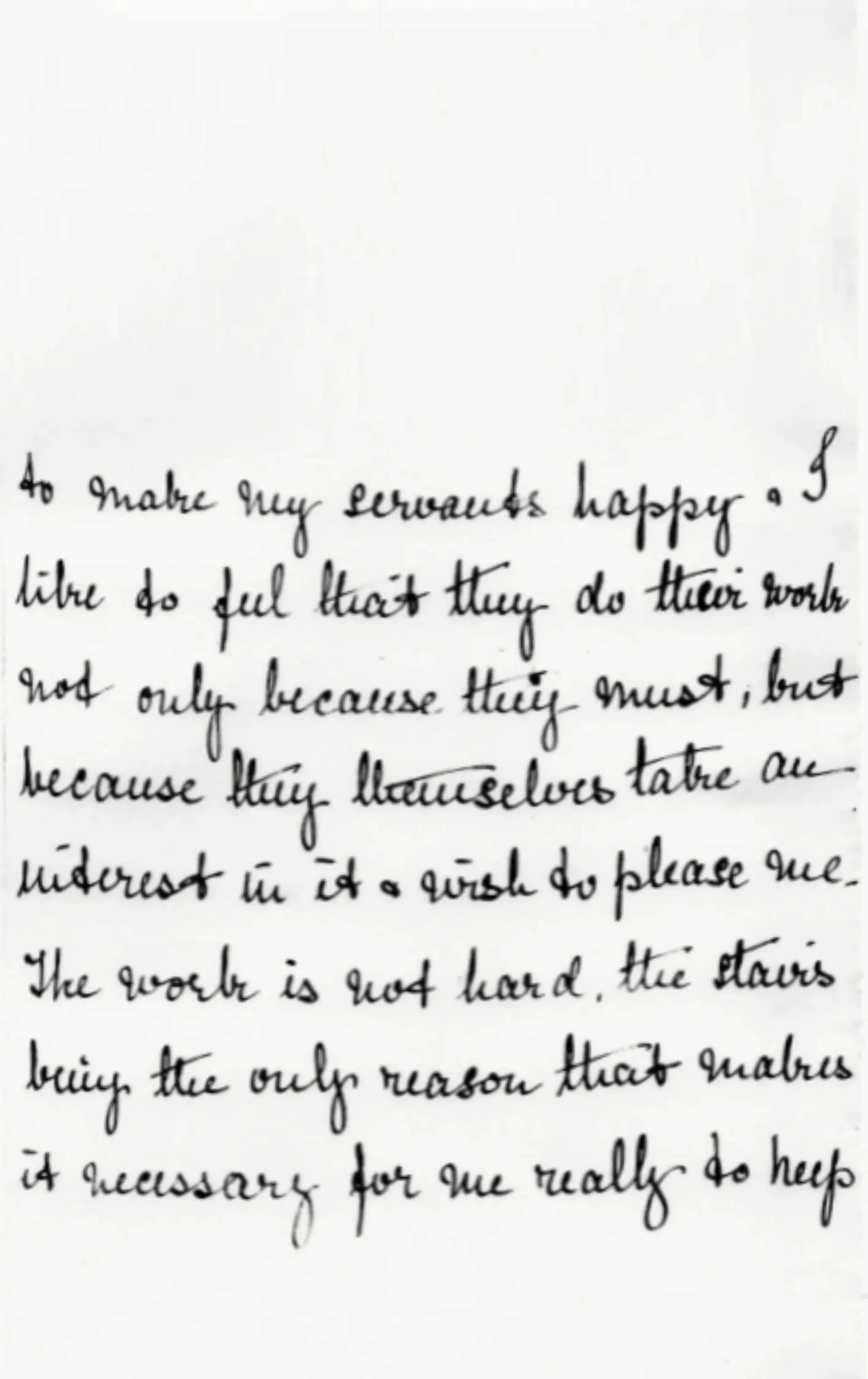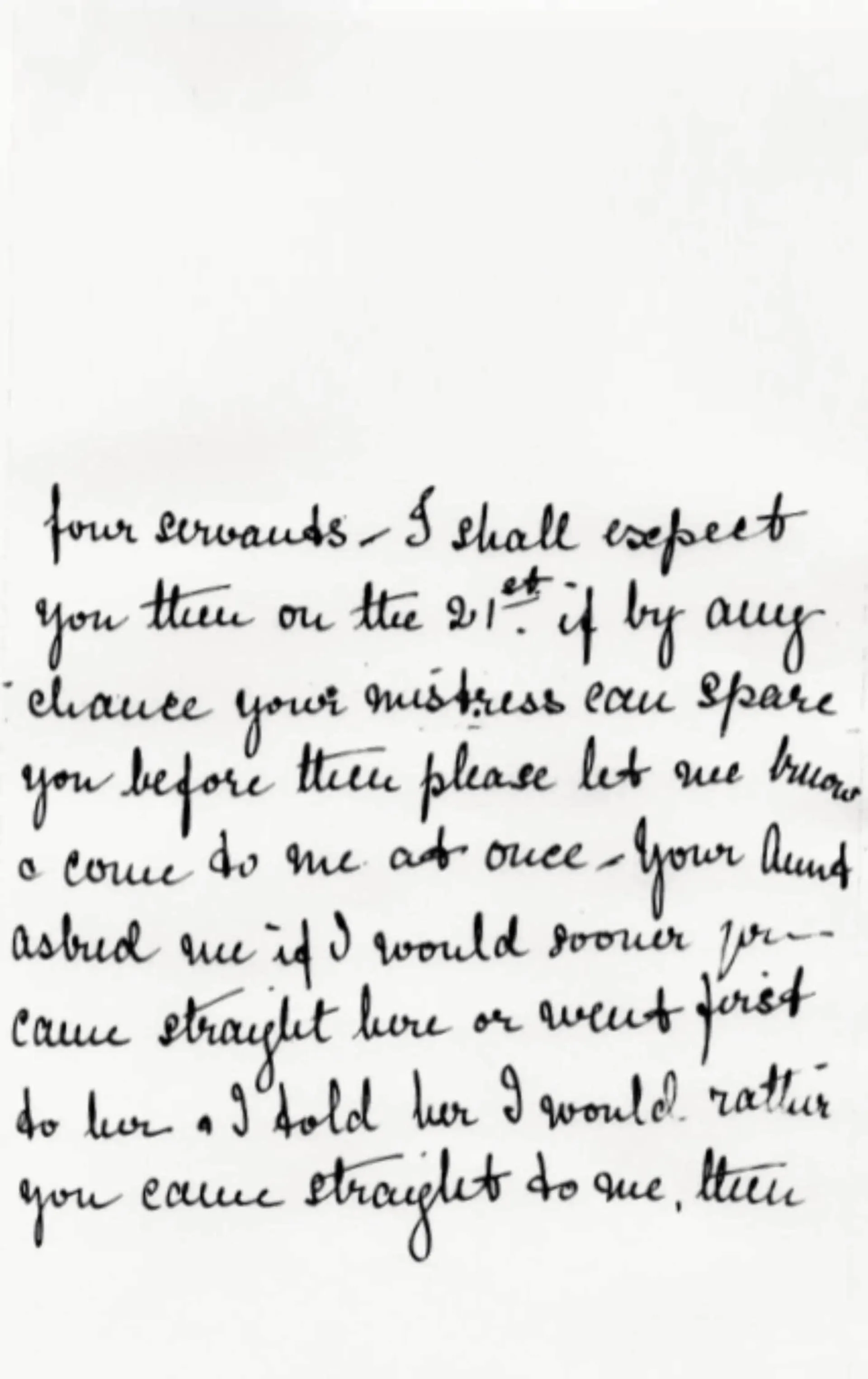 I am very glad to hear from you that you have made up your mind to take my situation & hope you will be happy here & make up your mind to stay with me. I try to make my servants happy & I like to feel that they do their work not only because they must, but because they themselves take an interest in it & wish to please me. The work is not hard, the stairs being the only reason that makes it necessary for me really to keep four servants— I shall expect you then on the 21st. If by any chance your mistress can spare you before then please let me know & come to me at once— Your Aunt asked me if I would sooner you came straight here or went first to her & I told her I would rather you came straight to me, then if there is any little thing you want to get for yourself, I would let you go out the first afternoon you could be spared to get it. Please write before the 21st & tell me what time you can get here that day. I should like you to arrive about three o’clock if possible— not later than 4 p.m. Your box you can send by Carter Patterson.