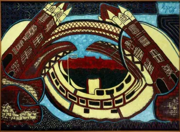 Nigerian-born artist Uzo Egonu (1931-1996) painted ‘Tower Bridge’ in 1969, a bold composition that merged abstraction with a cyclical, bird’s eye perspective.