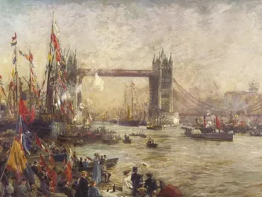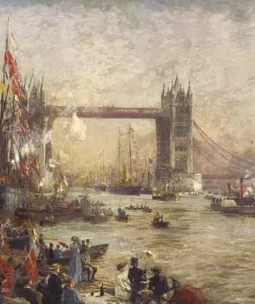William Lionel Wyllie attended Tower Bridge’s opening ceremony on 30 June 1894 and immortalised the festivities in an impressive oil on canvas. He rendered the landmark in etchings and watercolours, and produced a number of studies of the Thames that included commercial barges and imposing armoured cruisers.