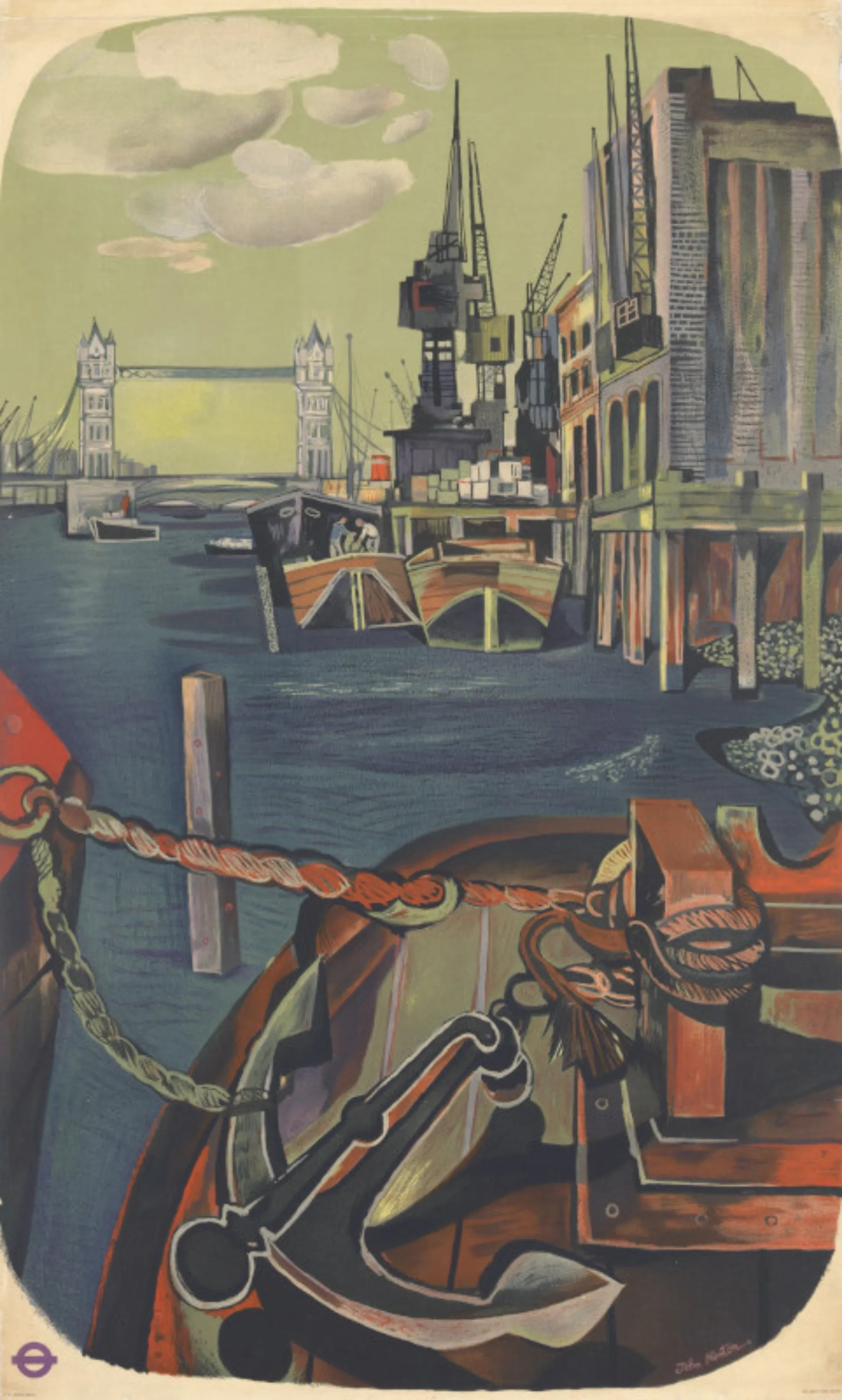 Minton first became known for his scenes of urban decay, which embodied the crude reality of post-war Britain. He captured the moody atmosphere of the cranes and wharves of the Port of London, with sailors working on boats or pairs of dockers moving boxes around the riverbank.