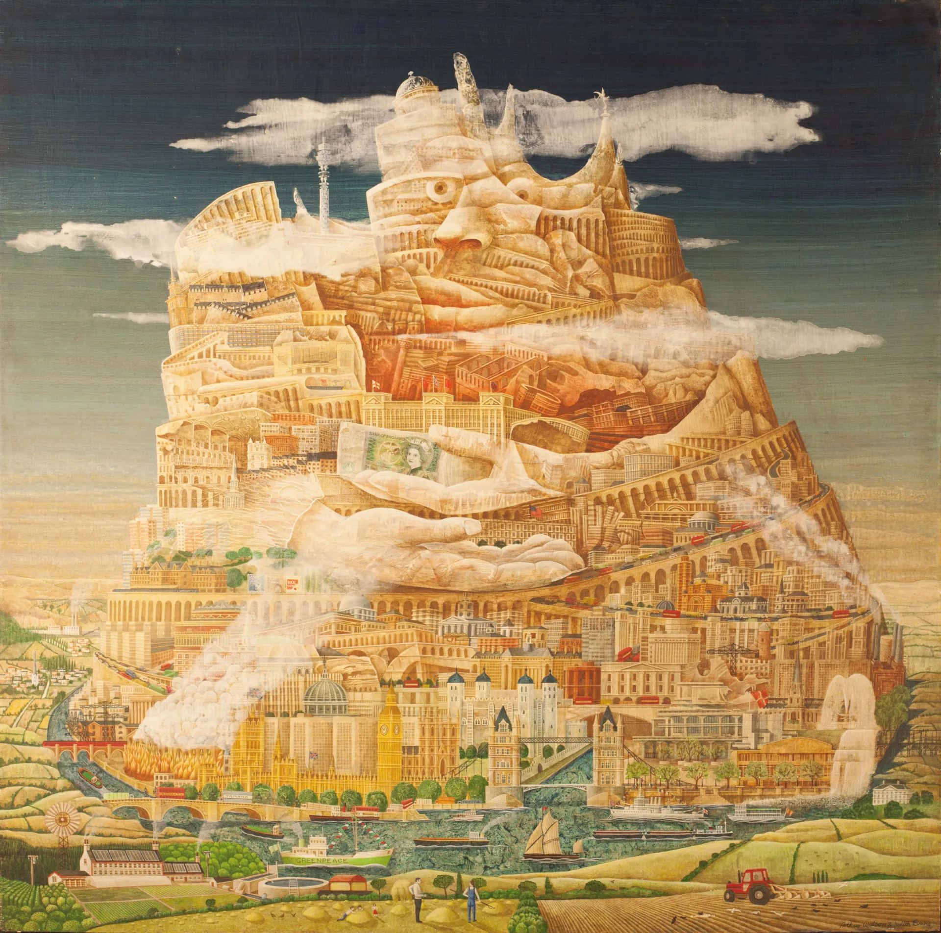 ‘The Spirit of London’ was based on the paintings of the Tower of Babel (c. 1563) by Pieter Bruegel the Elder (c. 1525-1569). Evans and Watson stated they aimed to ‘depict the City, destroying and recreating itself at the same time and continuously in flux and chaos’.