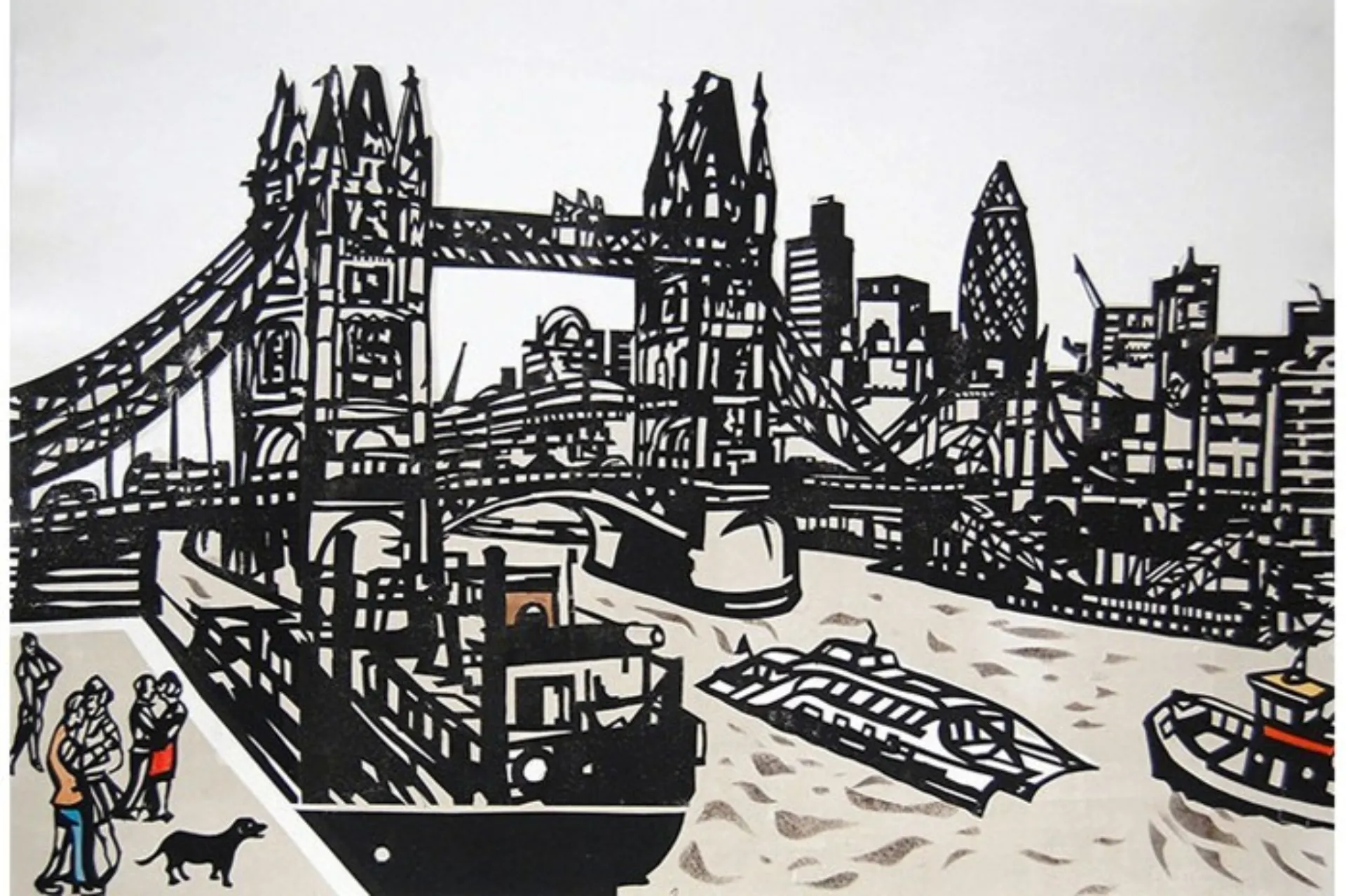 Mixed media artist Chris Orr (b. 1943) incorporates subjective and emotional narratives from his own experience, portraying London as a city that engenders contradiction, and setting Tower Bridge ‘as the gateway to London’. ‘London’s Dreaming’ (2001) and ‘Black Dog at Tower Bridge’ (2009) are stunning examples of the motif.